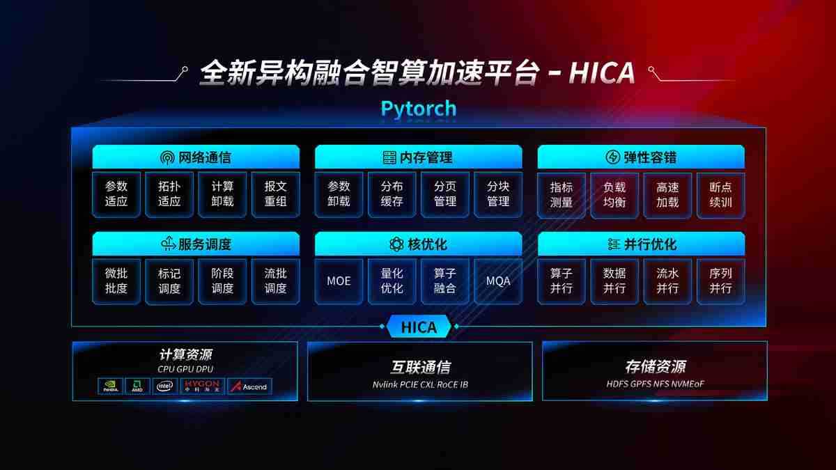 通过自研的服务层、、中间适配层、、、、以及调度编排算法,,,采用数据并行、、、、模型并行等多种并行方式,,把并行计算任务进行有效的分解,,使其分别由相应的软件栈和算力资源来承接。。。。当GPU资源变化,,,,HICA可以实时动态调度计算子任务并调整模型拓扑和架构,,以充分聚合各种算力资源。。