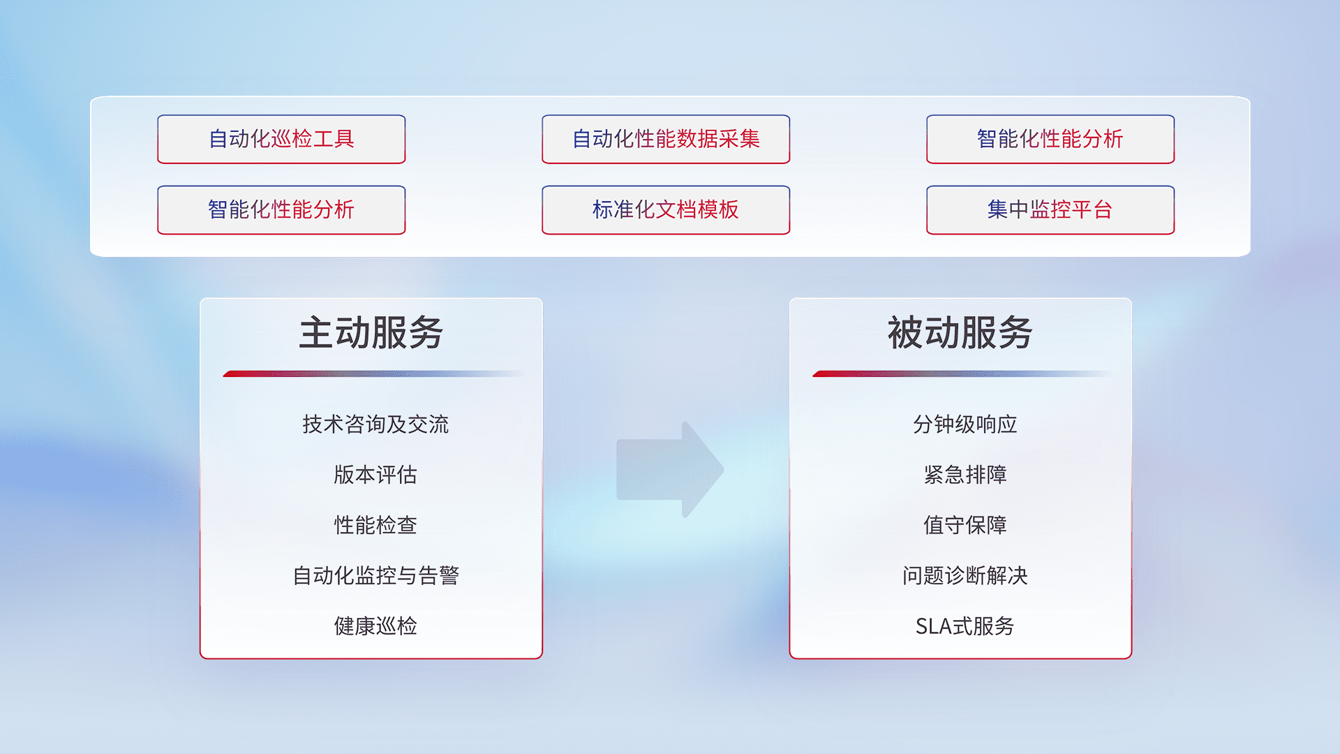 智能化工具和标准化文档,,保障服务质量,,,,提供主动服务(包含技术咨询、、、版本评估、、、、性能检查、、自动化监控与告警、、、、健康巡检)和被动服务包含(分钟级响应、、、、紧急排障、、、值守保障、、问题诊断解决、、SLA服务)。。。