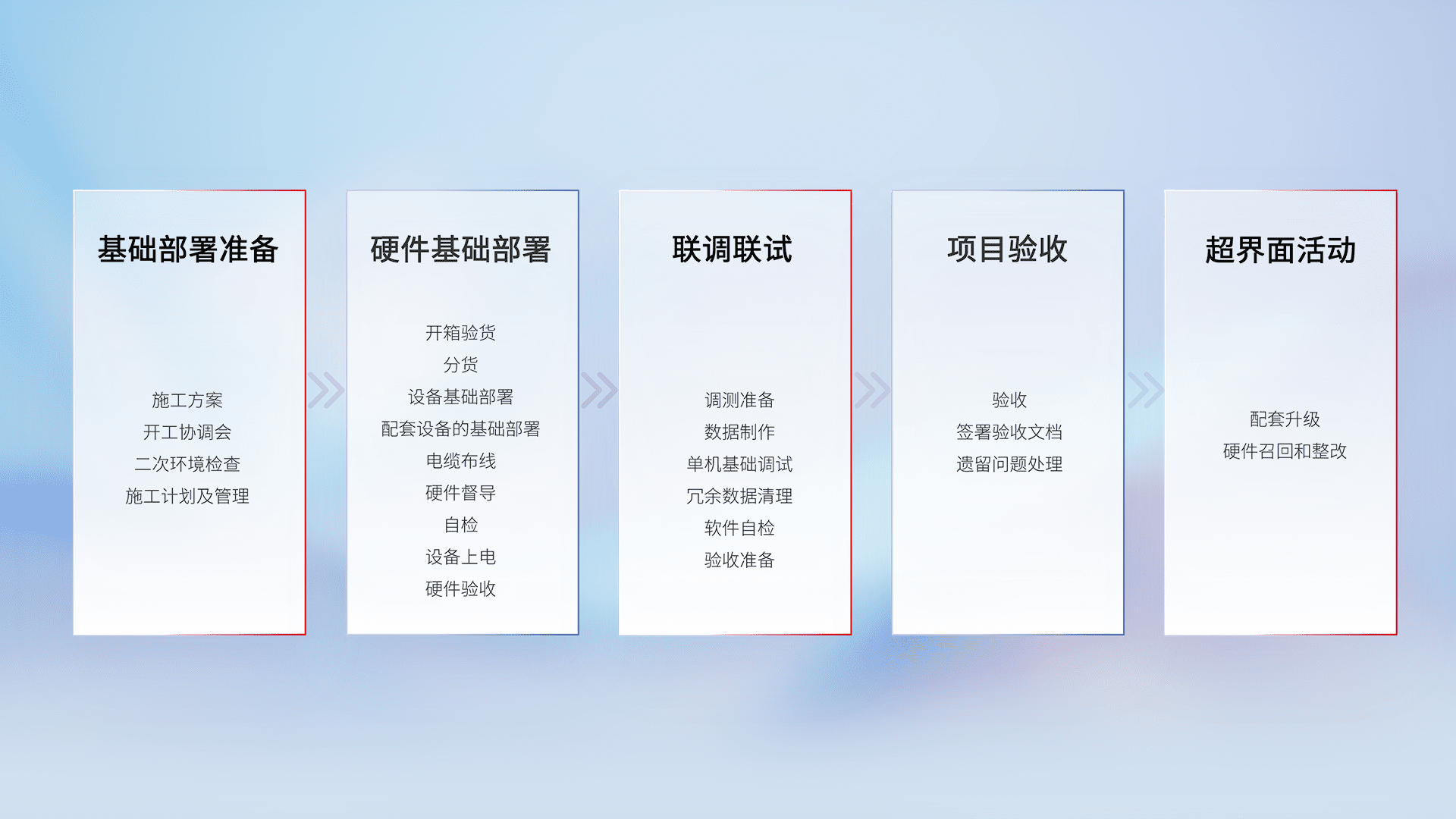 从基础部署准备、、、、硬件基础部署、、联调联试、、、、项目验收、、、越界面活动的全过程可追溯,,保证施工质量和进度。。